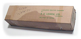 On Thanksgiving, November 24, 2005, on a visit to my grandmother's house, I rummaged around in her upstairs closet to find some of my grandfather's remaining piping related items. A long thin box containing a cheap Pakistani bagpipe (he was hoping one of his grandkids would learnwhile he was alive, but that didn't happen unfortunately), a paper bag containing a custom green bag cover with gold trim (sewn by a friend in the local Irish Club), and a thinnish box marked in pen with "Drone Reeds," but officially labeled: "A Bagpipe Practice Chanter by R. G. Lawrie, LTD. Glasgow Second to None."