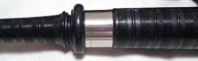 Also in mid-October 2006, Alec Smith of the Isle of Wight, England (a former turner for David Naill & Co.) pointed out the similarities between a set he has and my set. He picked the set up on eBay and the ebony chanter included with the pipes was stamped "R Gillanders, Forfar" indicating a possible, but not sure, link of the drones themselves with Gillanders.) If you look at the company history page of the Gillanders and McLeod website, they tell that Robert Gillanders was a turner with the Thow Brothers in Dundee until he left in 1926 to start his own company Robert Gillanders - Bagpipe Makers. Right around 1956 the shop moved to Forfar and the name was changed to R. Gillanders & Son. Assuming the chanter belongs with Alec's pipes, the tenor drone in the photo below would have been made between 1956 and 1972 at which point Iain McLeod bought the company and changed the name to Gillanders & McLeod.